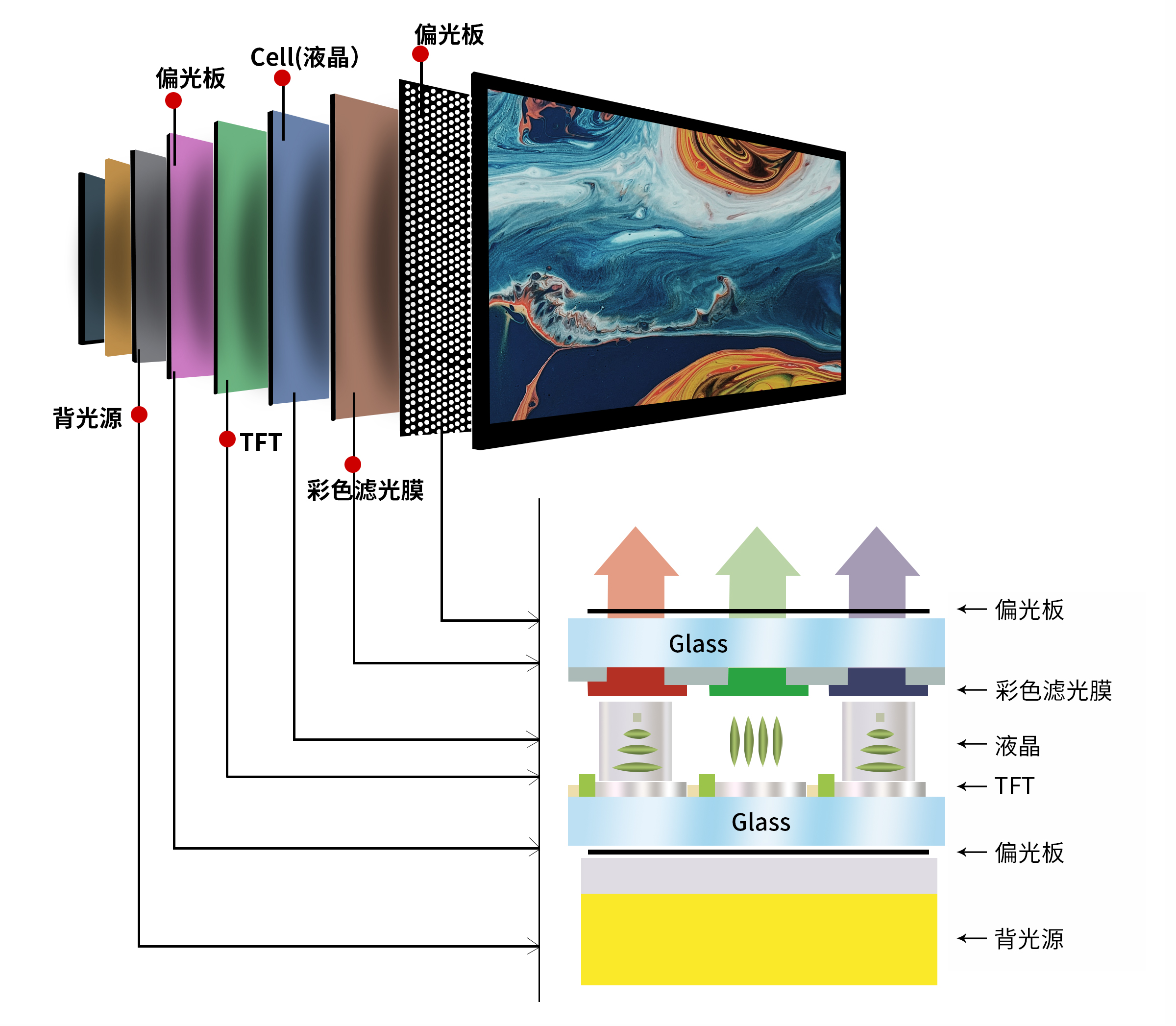 LCD全稱(chēng)為L(cháng)iquid Crystal Display,即液晶顯示,它為顯示領(lǐng)域開(kāi)創(chuàng )了一個(gè)全新的時(shí)代。其顯像原理是通過(guò)“背透式”照射方式,將熒光燈管投射到光源上,讓光線(xiàn)通過(guò)彩色濾光片,將其與偏光板過(guò)濾后再進(jìn)入由液晶組成的液晶層。
